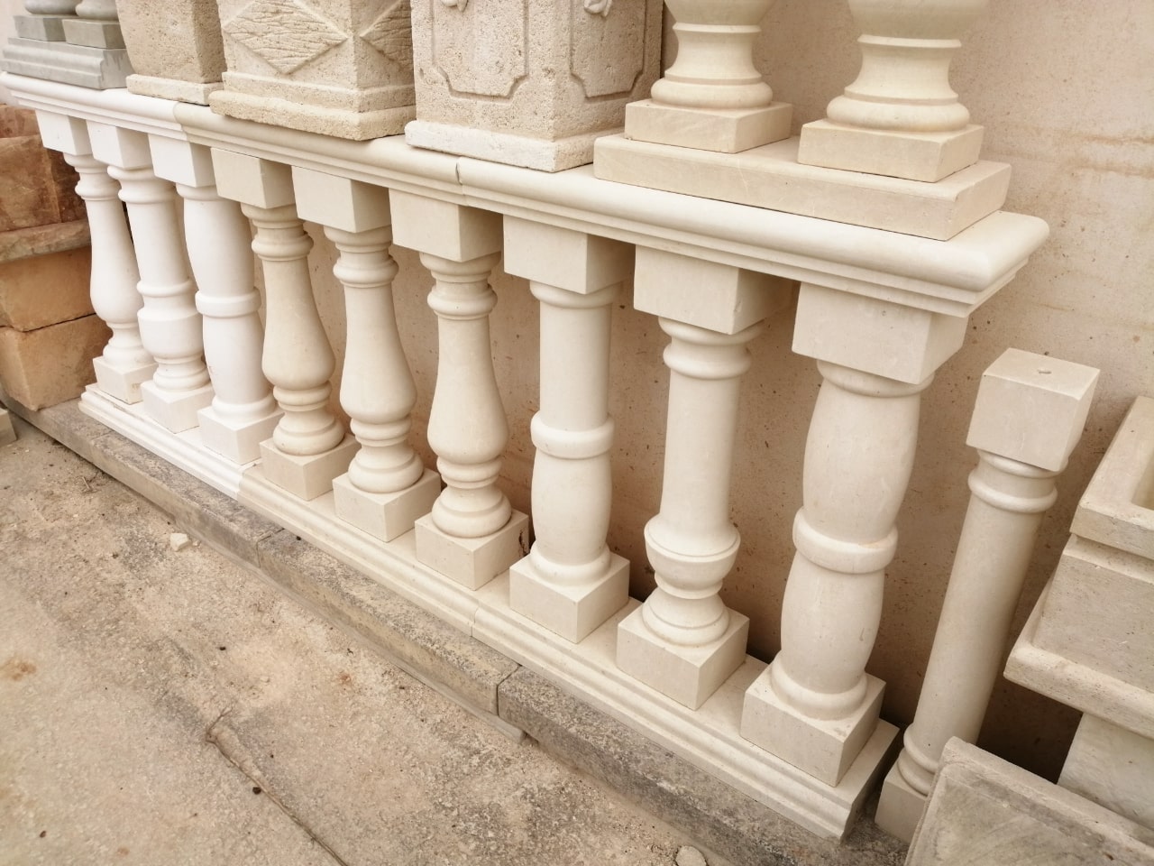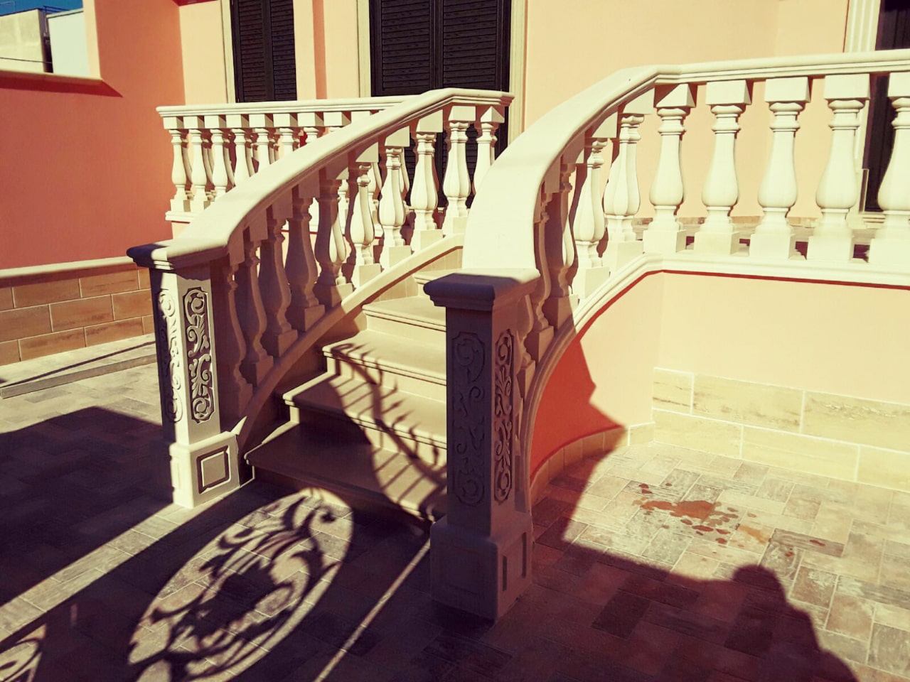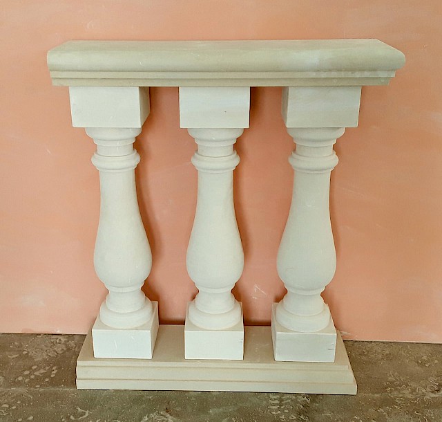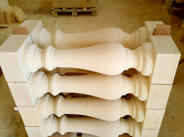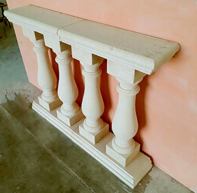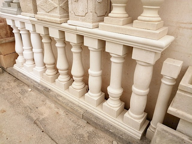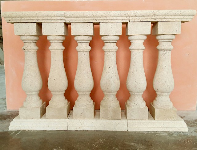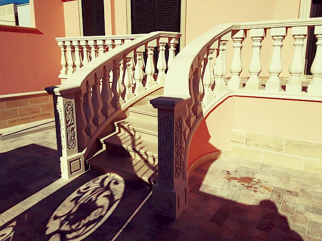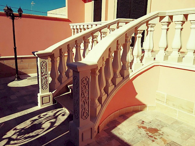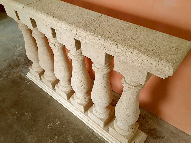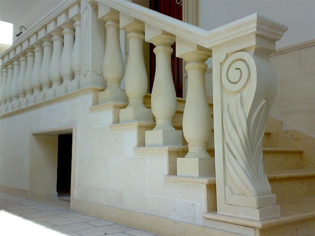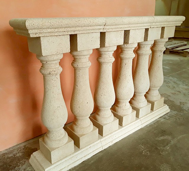 We craft handmade balustrades and balusters in Pietra Leccese, Carparo, or Tufo, each carved from solid stone blocks and refined with care using traditional techniques. The balusters can be smooth, turned, or adorned with decorative motifs, and may include classical elements such as spheres, molded bases, and matching handrails.