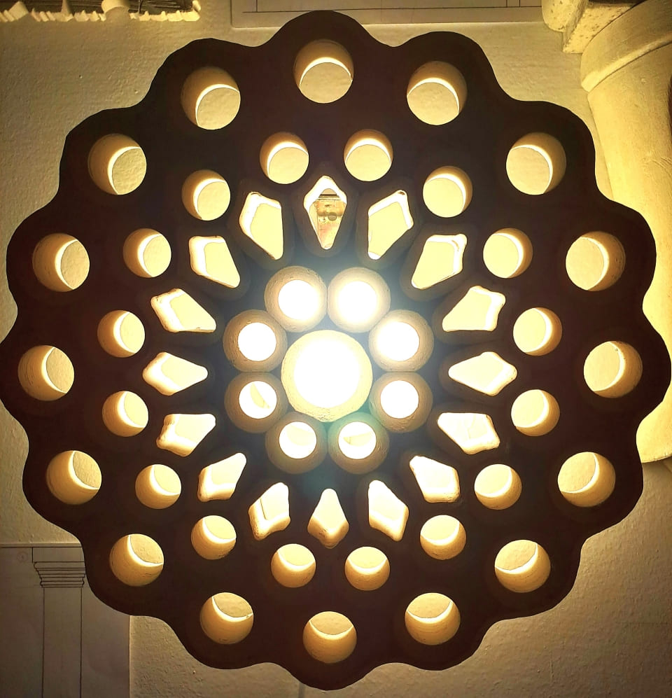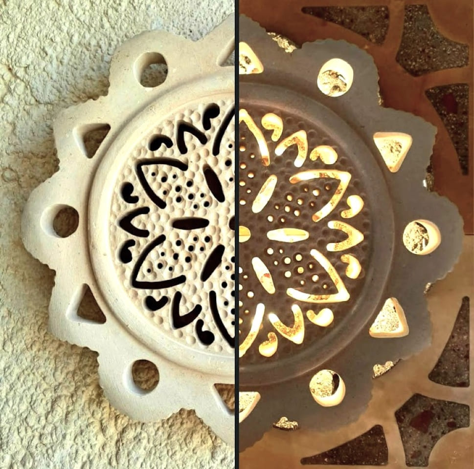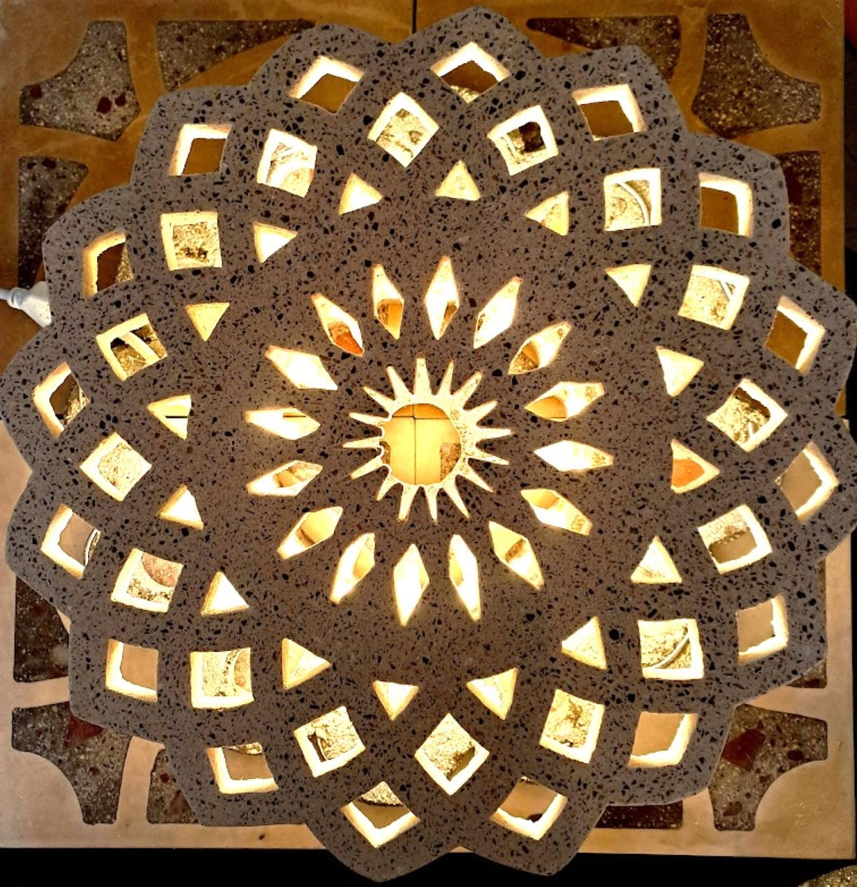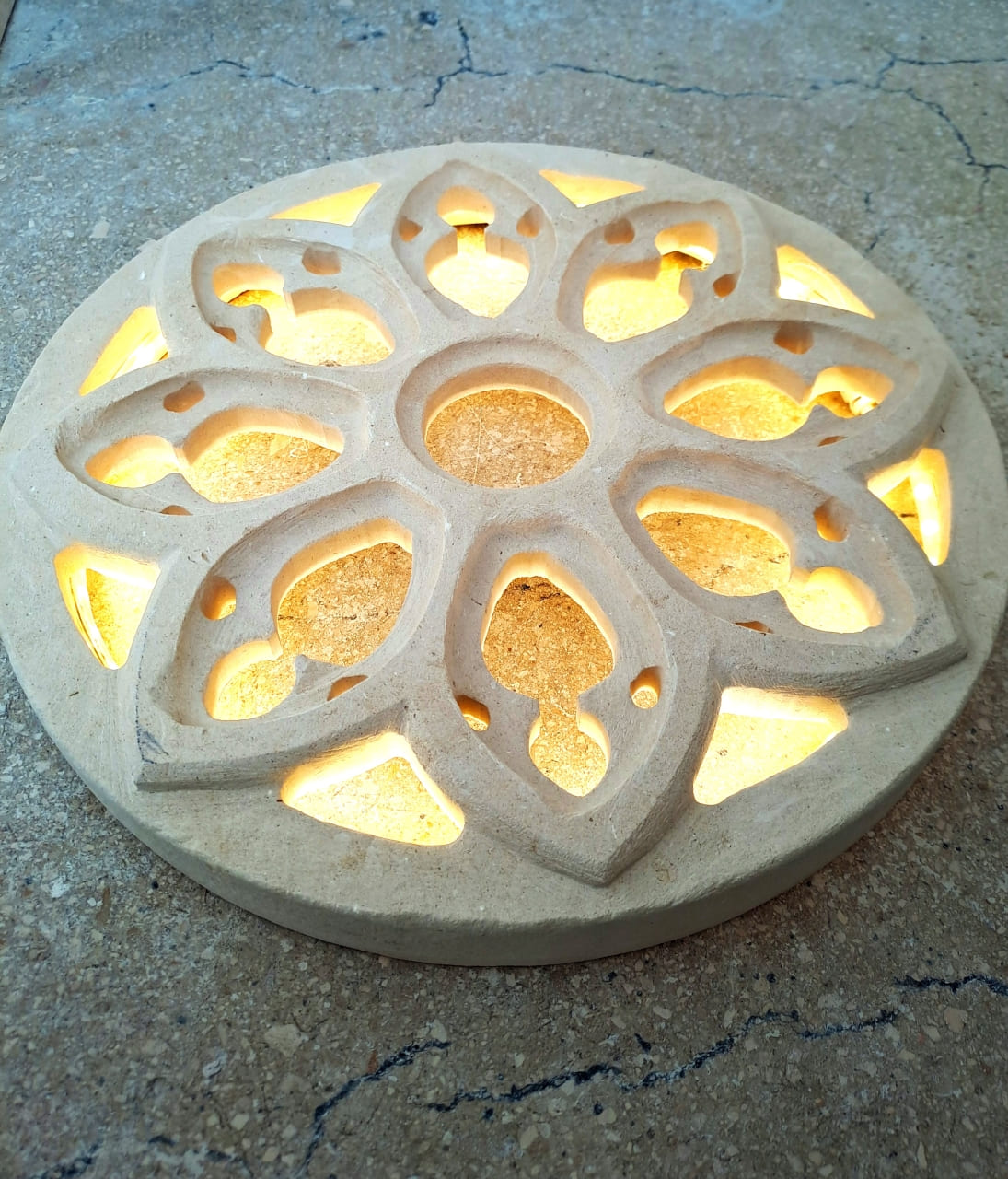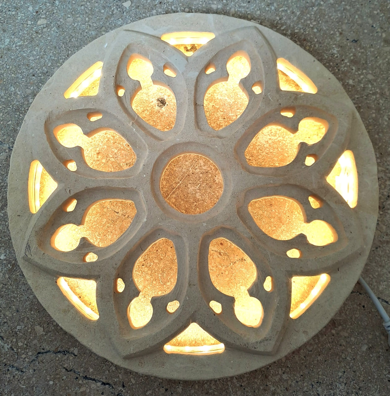 Each rosette is handcrafted using natural stone or stone-based compounds, materials that allow artisans to create refined surfaces, precise details and a warm, natural aesthetic. The manual carving process makes it possible to create perforated patterns and engraved decorations which, when illuminated from behind, produce beautiful light and shadow effects on the surrounding walls. Thanks to their internal lighting, these stone rosettes become true decorative lighting elements capable of creating atmosphere and character within a space. The light filtering through the carved patterns enhances the texture of the stone while spreading a soft and welcoming glow, ideal for living rooms, entrances, hallways or commercial environments.