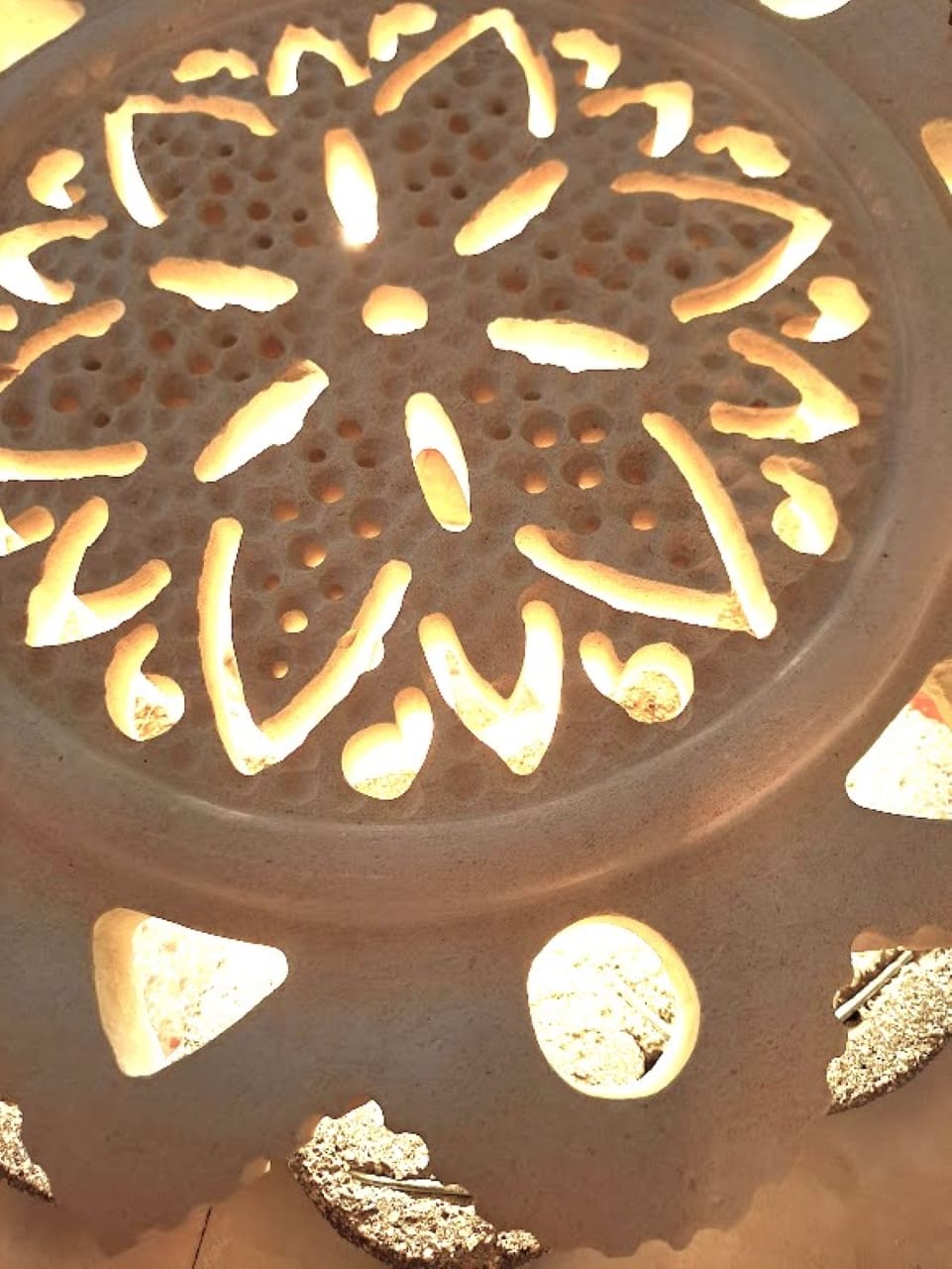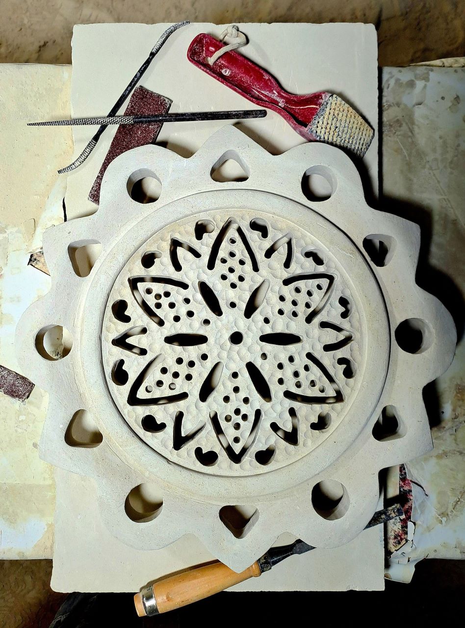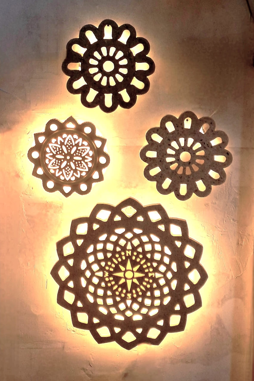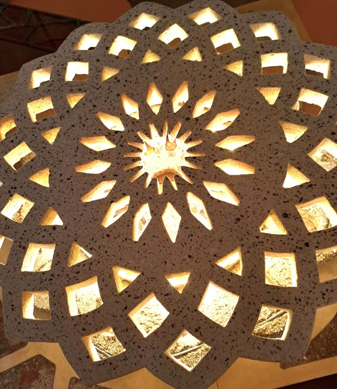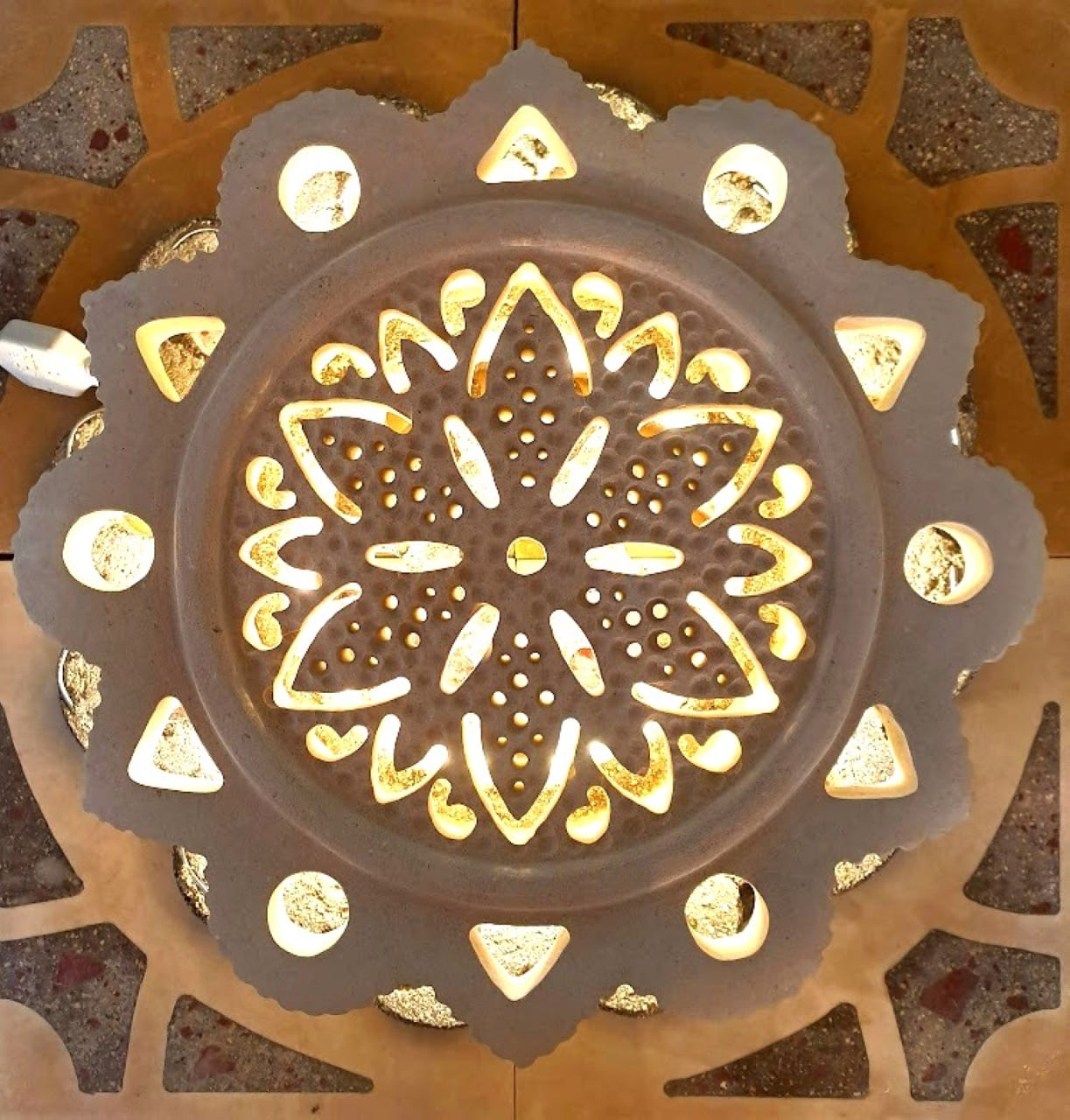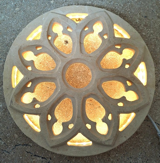 Each rosette is handcrafted using natural stone or stone-based compounds, materials that allow artisans to create refined surfaces, precise details and a warm, natural aesthetic. The manual carving process makes it possible to create perforated patterns and engraved decorations which, when illuminated from behind, produce beautiful light and shadow effects on the surrounding walls. Thanks to their internal lighting, these stone rosettes become true decorative lighting elements capable of creating atmosphere and character within a space. The light filtering through the carved patterns enhances the texture of the stone while spreading a soft and welcoming glow, ideal for living rooms, entrances, hallways or commercial environments.
