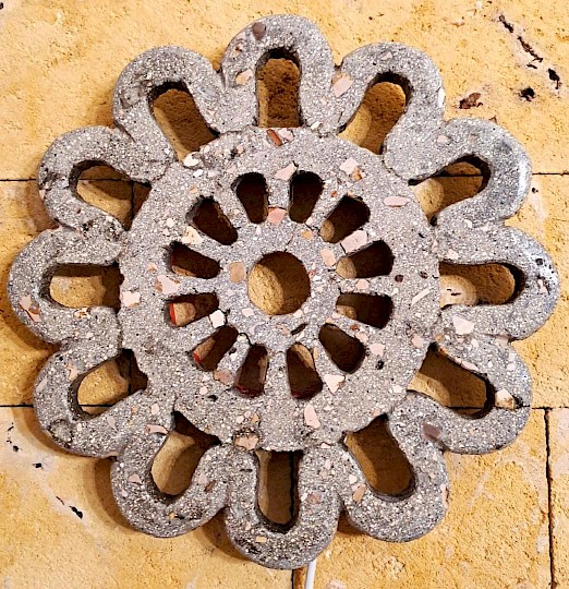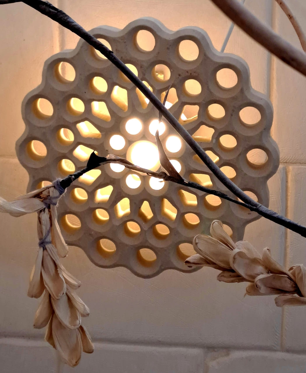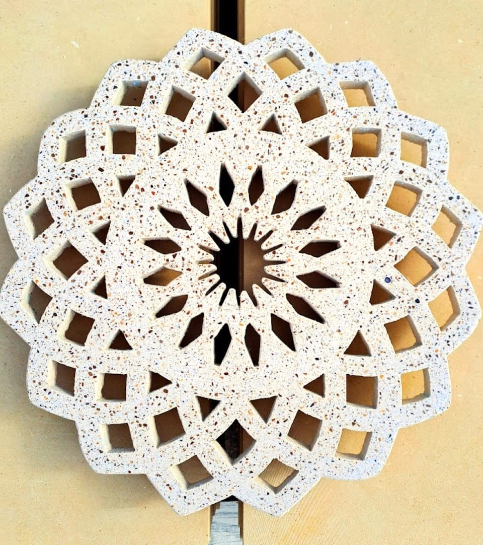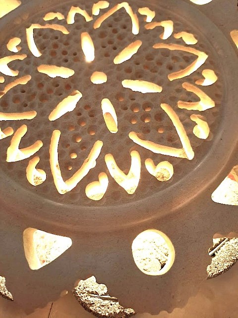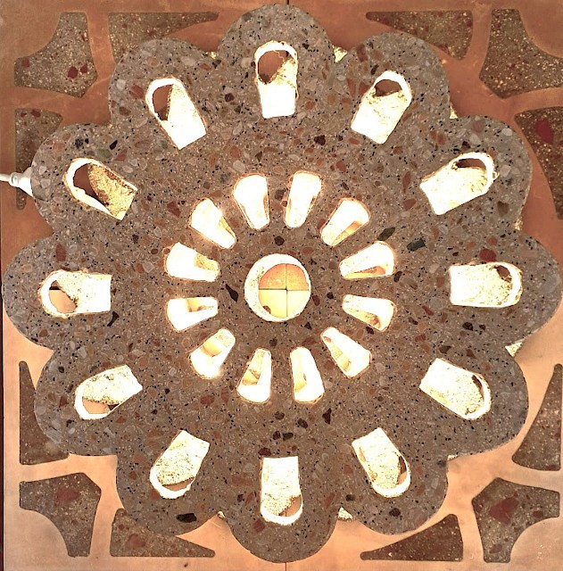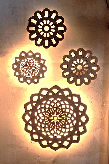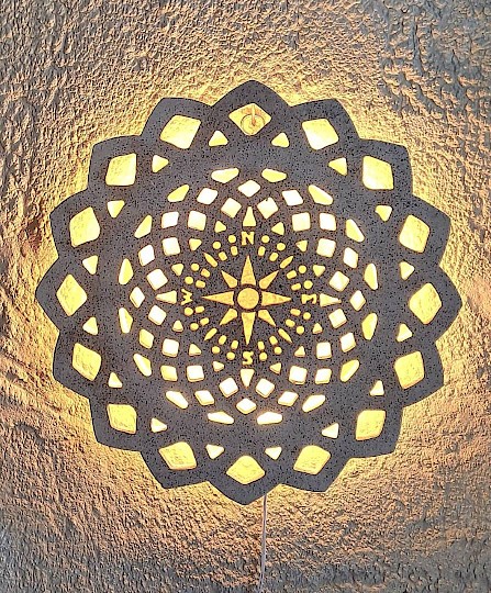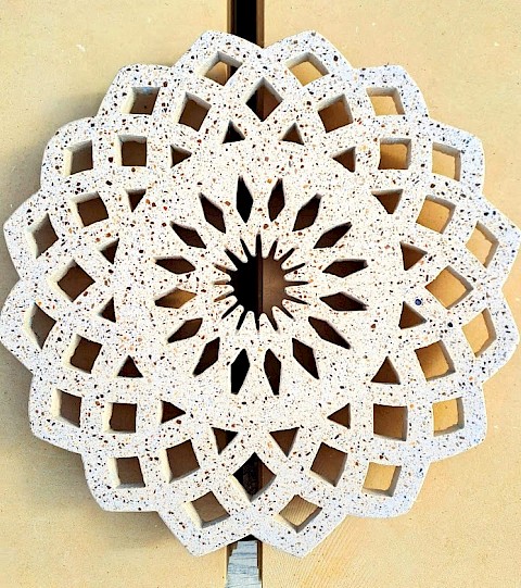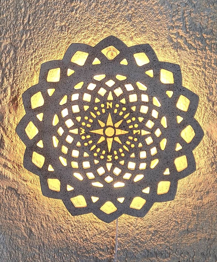 Each rosette is handcrafted using natural stone or stone-based compounds, materials that allow artisans to create refined surfaces, precise details and a warm, natural aesthetic. The manual carving process makes it possible to create perforated patterns and engraved decorations which, when illuminated from behind, produce beautiful light and shadow effects on the surrounding walls. Thanks to their internal lighting, these stone rosettes become true decorative lighting elements capable of creating atmosphere and character within a space. The light filtering through the carved patterns enhances the texture of the stone while spreading a soft and welcoming glow, ideal for living rooms, entrances, hallways or commercial environments.